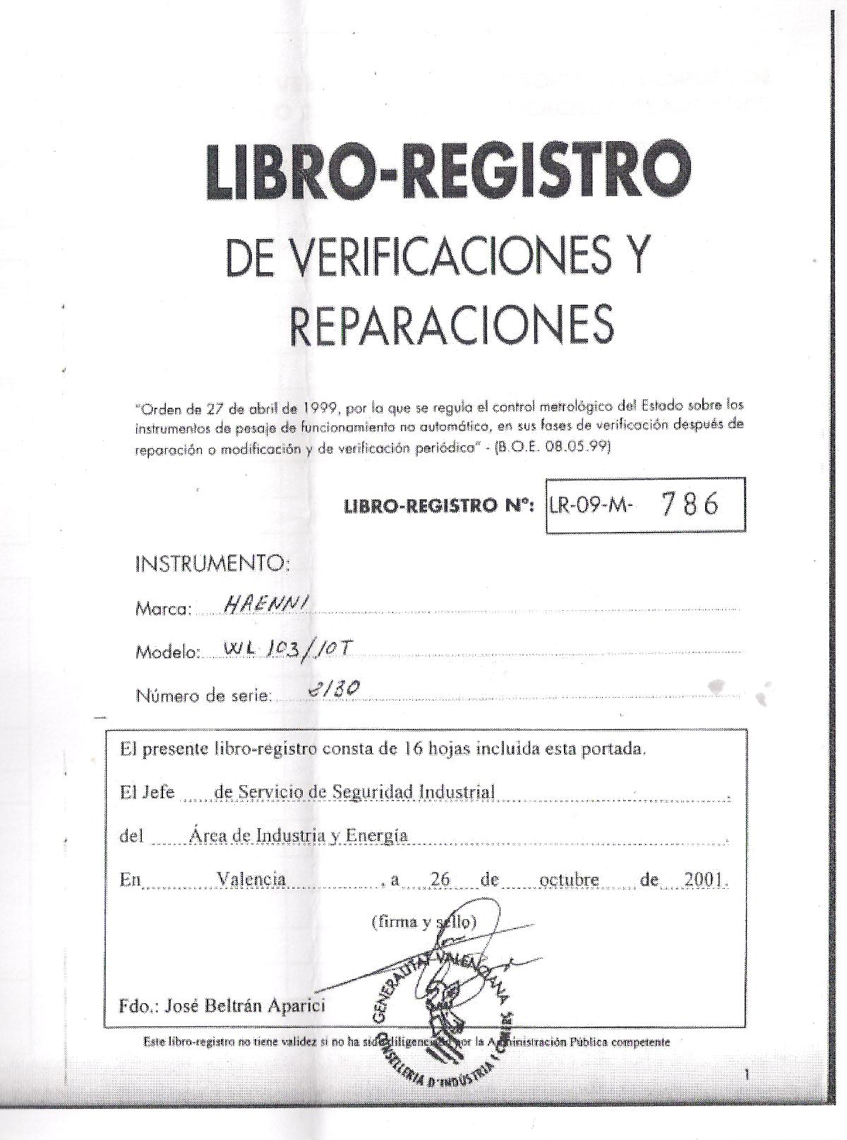 Adjunto a la denuncia "expediente sancionador" me adjuntan tambien un Libro-Registro de verificaciones y reparaciones de la bascula. Os adjunto el archivo del libro registro para que veais una cosa, que creo que es la que me puede salvar de la mutla presentando un recurso. Yo observo que las revisiones periodicas se han realizado cada 2 años, sin embargo, la fecha de ultima revision consta del 23/09/09. ¿Podria acogerme a que la bascula no ha pasado la revision? ¿Que se os ocurre? Un saludo a todos y gracias de antemano. Las fotografias mirarlas de abjo a arriba, es decir, la de abajo del todo es la primera portada, seguida de su ficha, y la 3ª por debajo la 2ª portada y justo encima su ficha de revisiones. Saludos!!