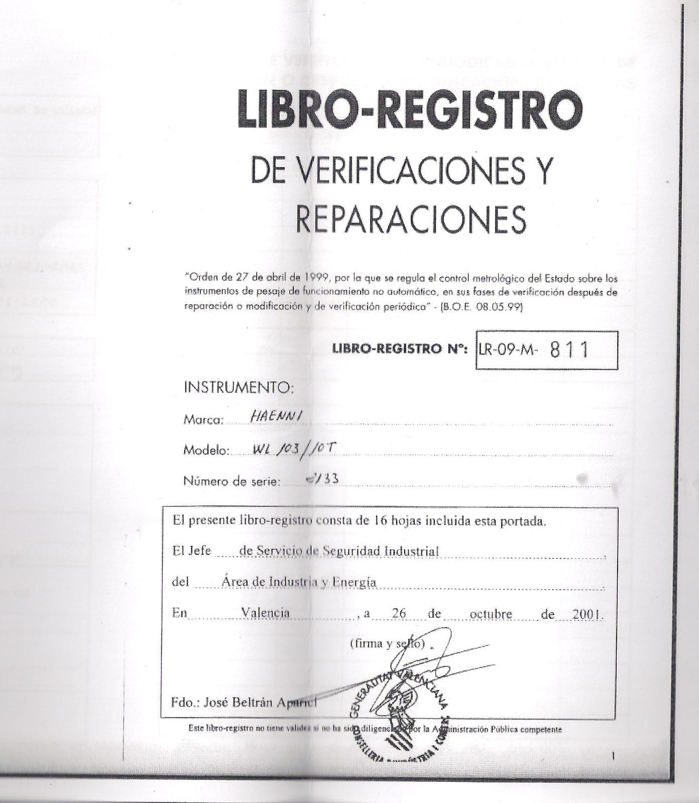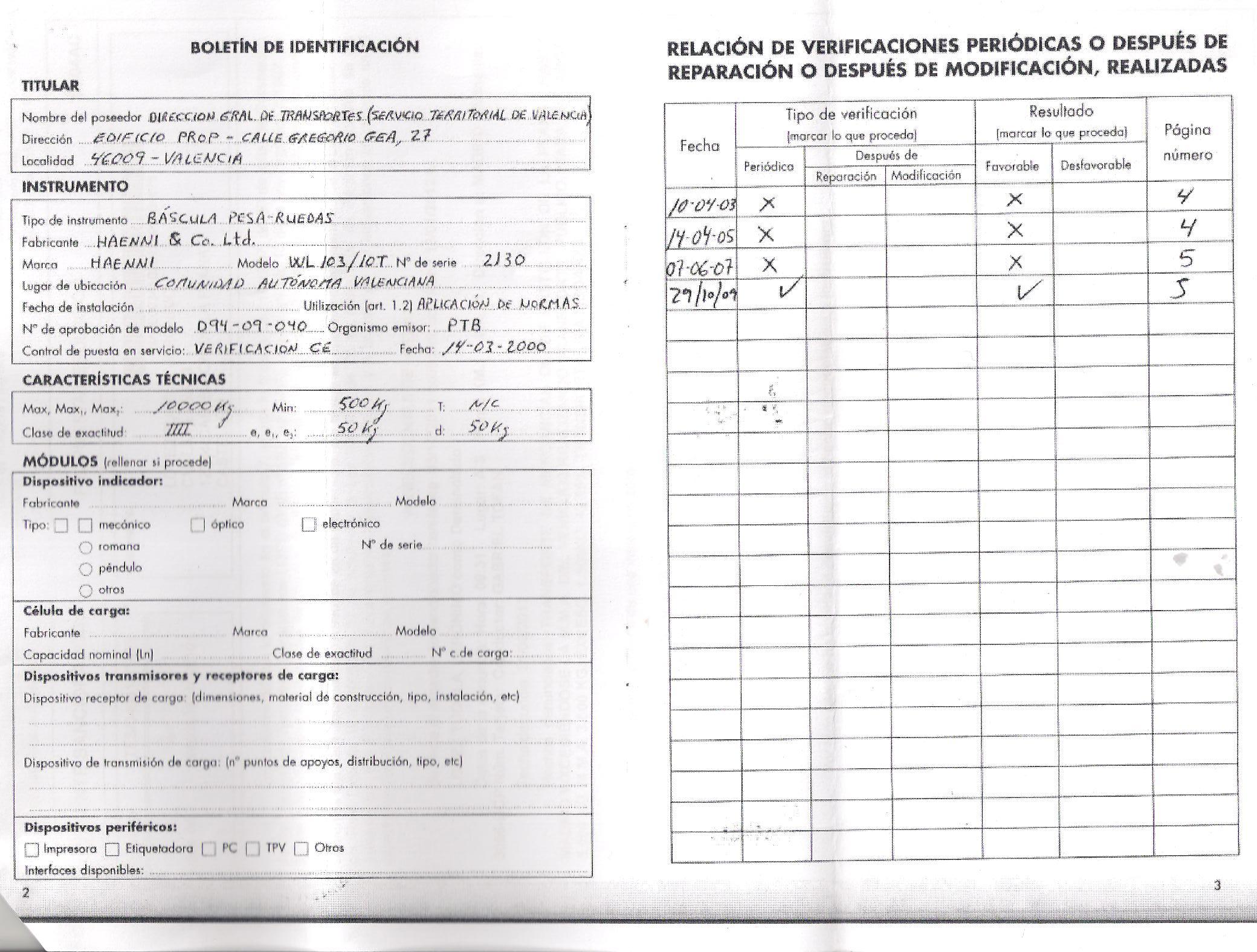 Adjunto a la denuncia "expediente sancionador" me adjuntan tambien un Libro-Registro de verificaciones y reparaciones de la bascula. Os adjunto el archivo del libro registro para que veais una cosa, que creo que es la que me puede salvar de la mutla presentando un recurso. Yo observo que las revisiones periodicas se han realizado cada 2 años, sin embargo, la fecha de ultima revision consta del 23/09/09. ¿Podria acogerme a que la bascula no ha pasado la revision? ¿Que se os ocurre? Un saludo a todos y gracias de antemano. Las fotografias mirarlas de abjo a arriba, es decir, la de abajo del todo es la primera portada, seguida de su ficha, y la 3ª por debajo la 2ª portada y justo encima su ficha de revisiones. Saludos!!
