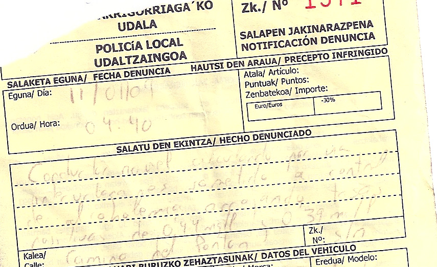 En la "notificación denuncia" que me dieron (un papelito amarillo) vienen rellenados todos los datos (matricula, hecho denunciado, nombre...) menos el precepto infringido donde está "Articulo:", "Puntos:" e "Importe:". Esta parte está sin rellenar. Debajo de esto hay un cuadro donde pone "euros" y "-30%" pero no han escrito ningún numero. (Ver foto adjuntada)